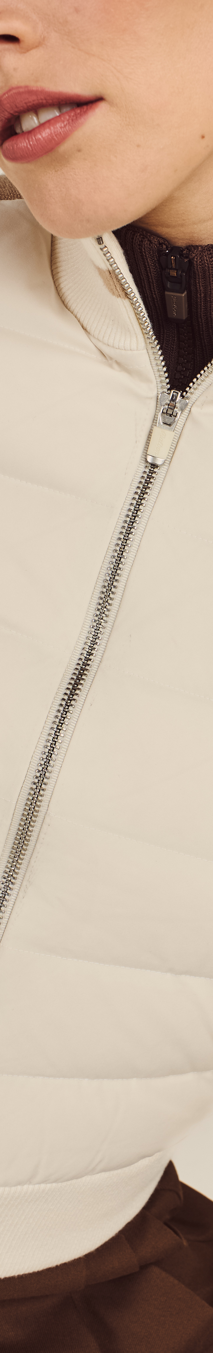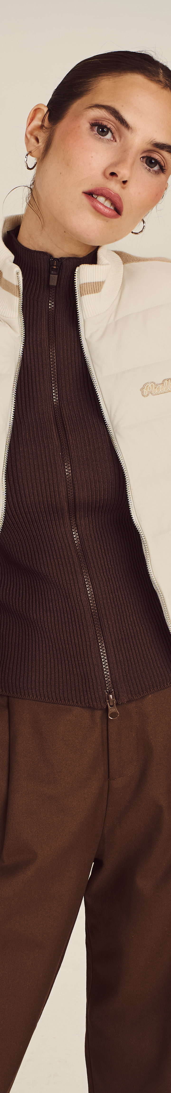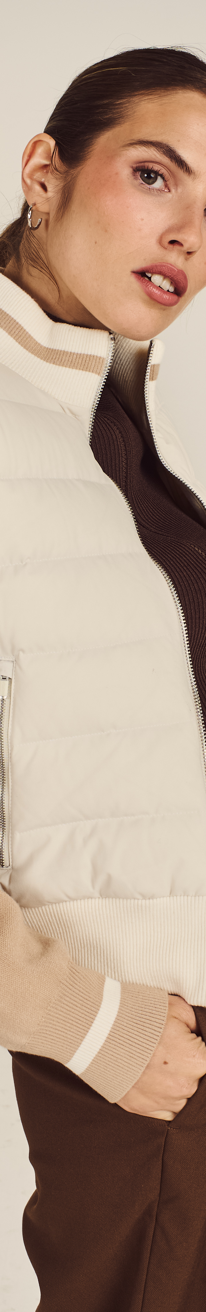 Our Ayda Hybrid Jacket merges insulation with mobility. Built with a padded front panel with premium goose down and feather filling, it has a ribbed trim to seal in heat. Lightweight protection meets targeted warmth.