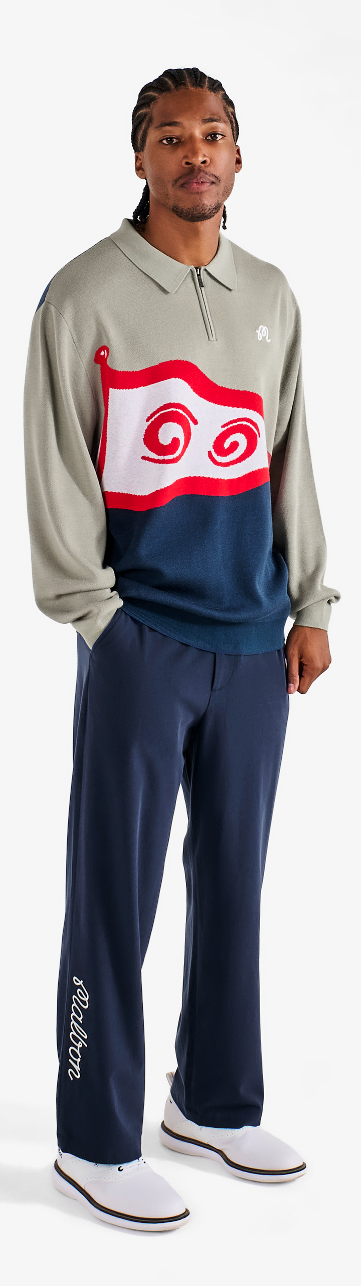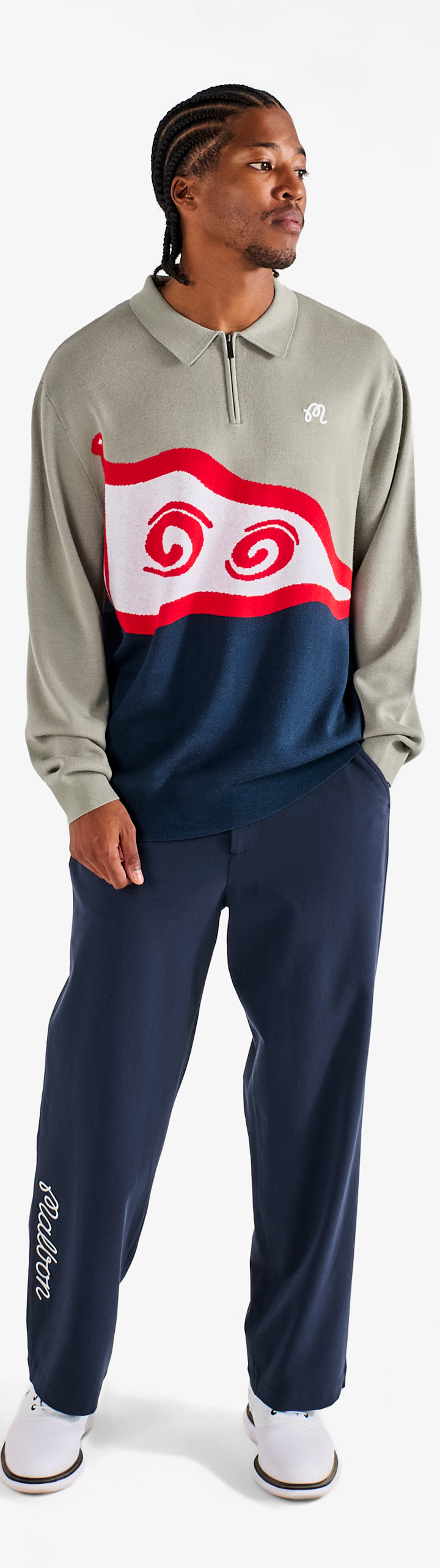 Showcasing our flag graphic in an intarsia knit across the front, this quarter zip Burgee Sweater is finely tailored for a relaxed fit—a perfect piece to suit any occasion.