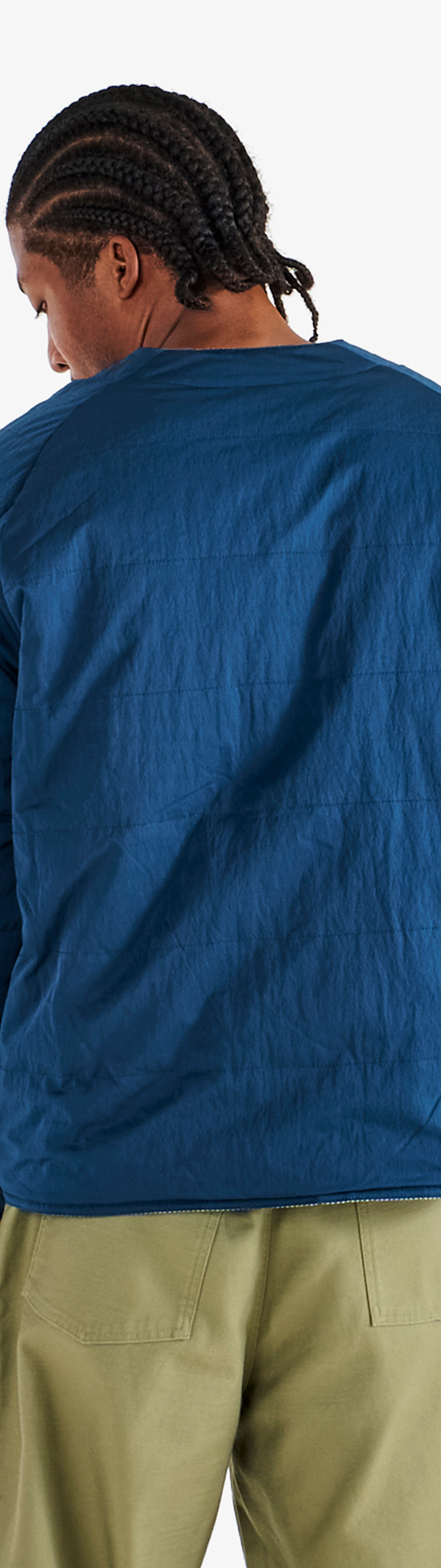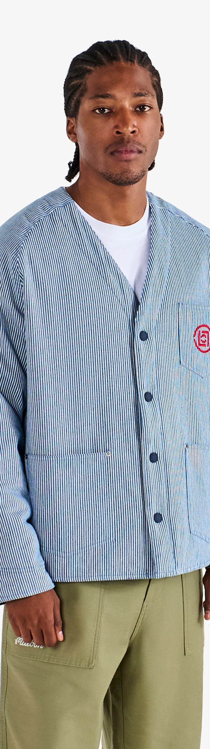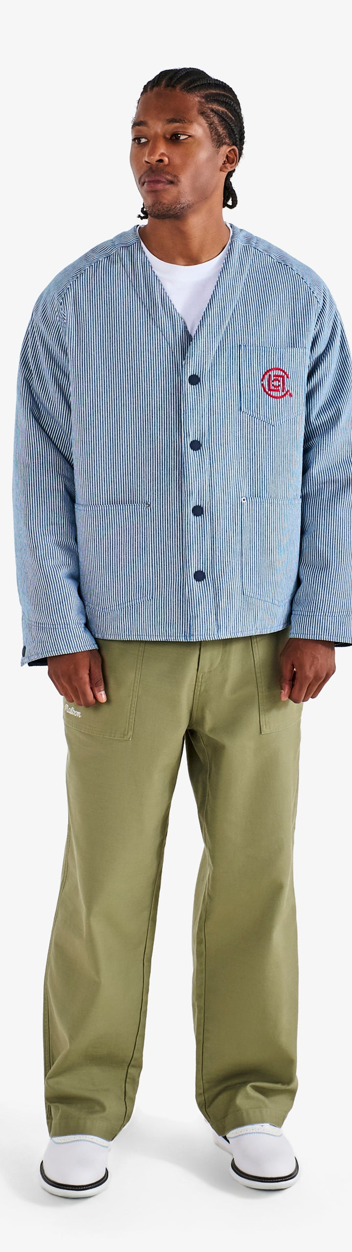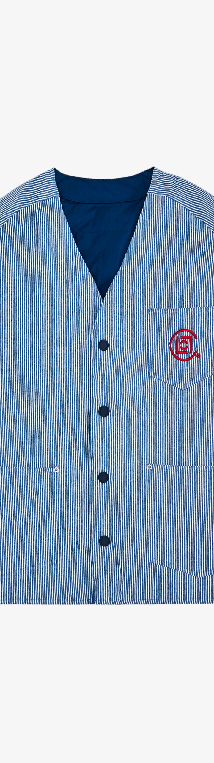 A standout from our collaboration with CLOT, this reversible jacket offers two looks in one. One side is crafted from cotton, hickory-striped denim, while the other is cut from a smooth solid-colored poly blend. Cut with a cardigan-style v-neckline, button closure and cuffs, it balances a workwear sensibility with refined design.