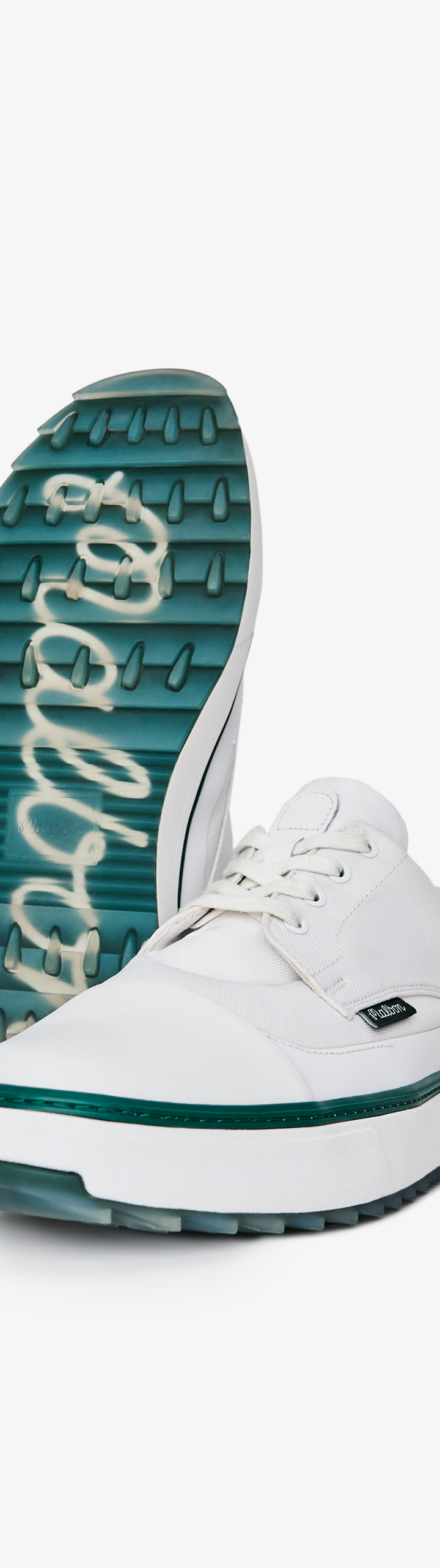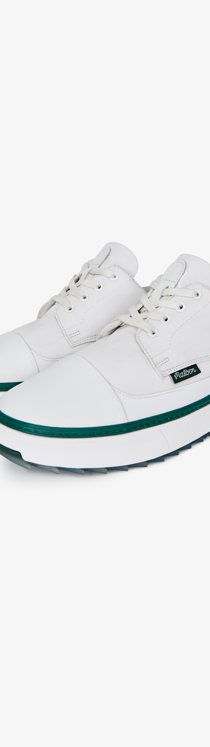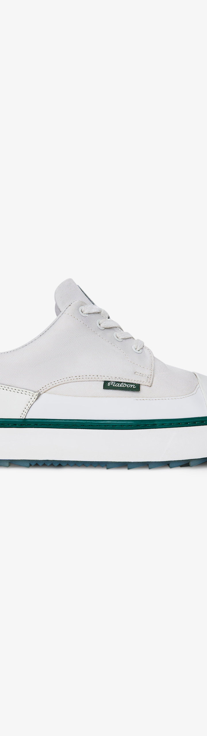 A low-top silhouette inspired by formal derby shoes, they're crafted with a polyester canvas and hot-melt construction that gently wraps the foot, while natural leather on the toe box provides a stable, comfortable fit. The spikeless outsole—shared with our Course shoe—delivers excellent traction and walking stability, while the design blends classic and street accents, pushing them beyond traditional golf footwear.