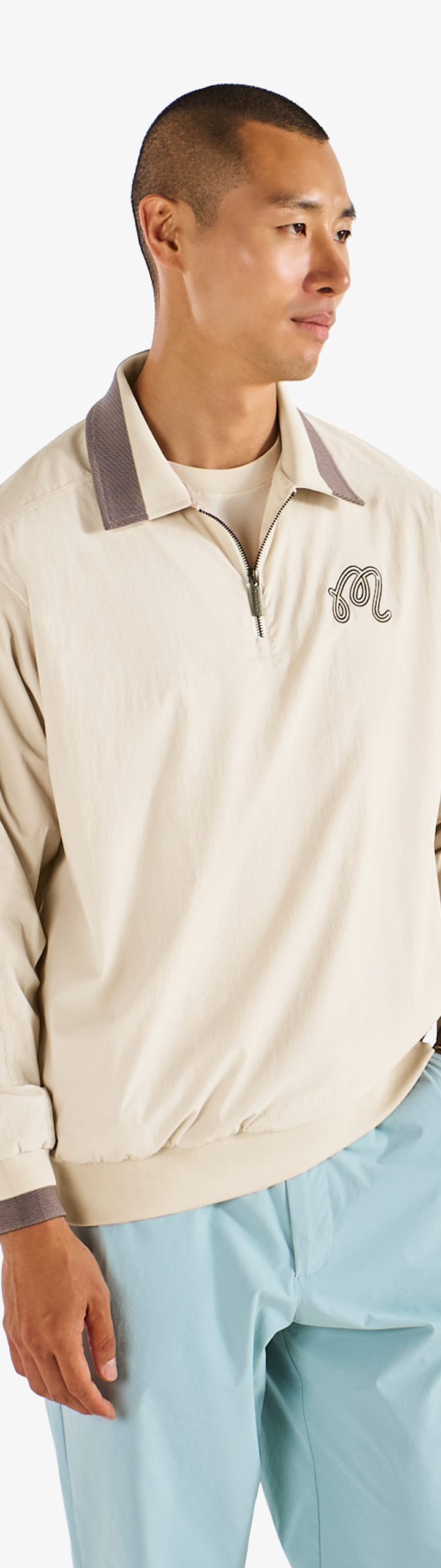 - Embroidered M script logo on left chest