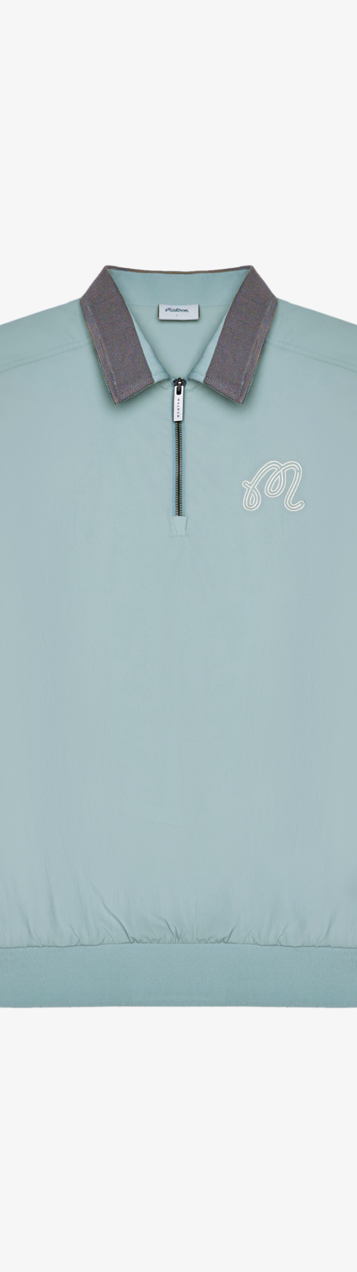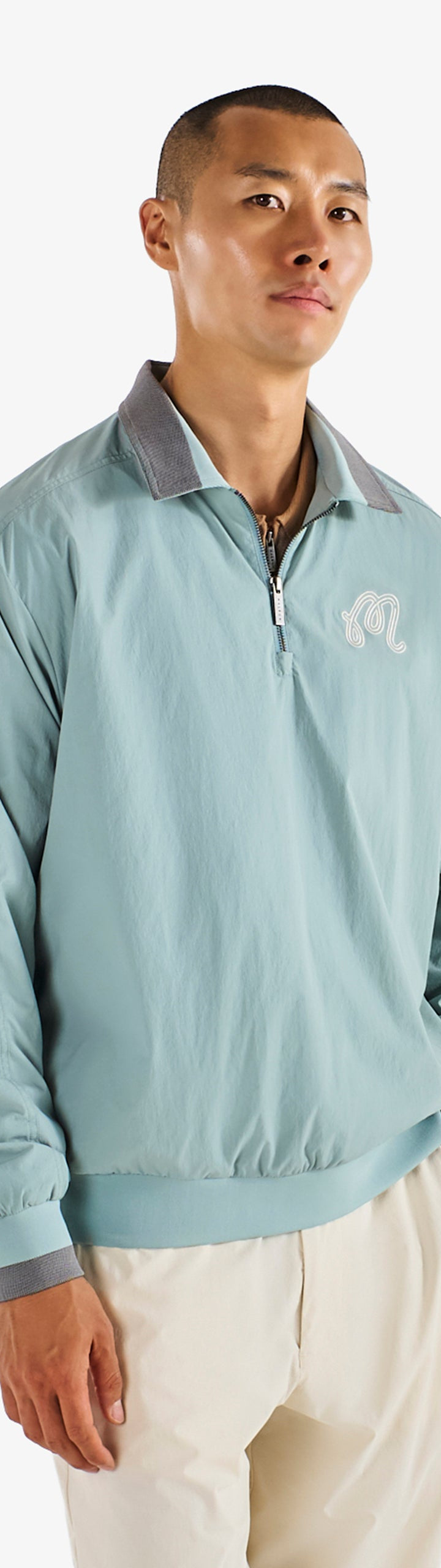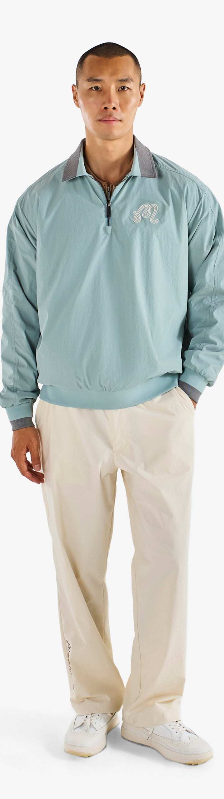 - Embroidered M script logo on left chest