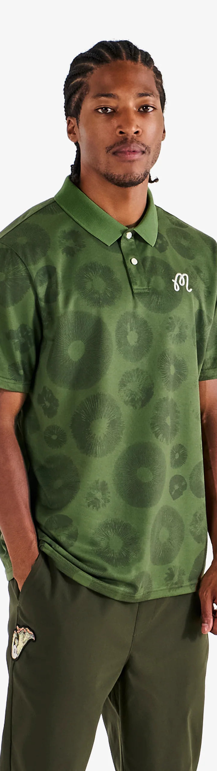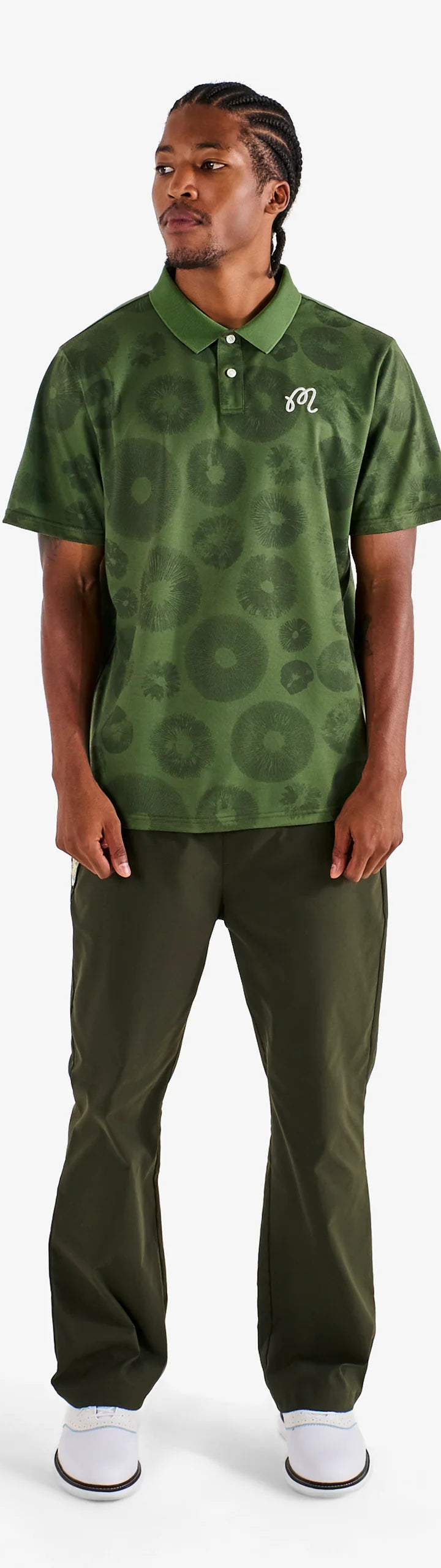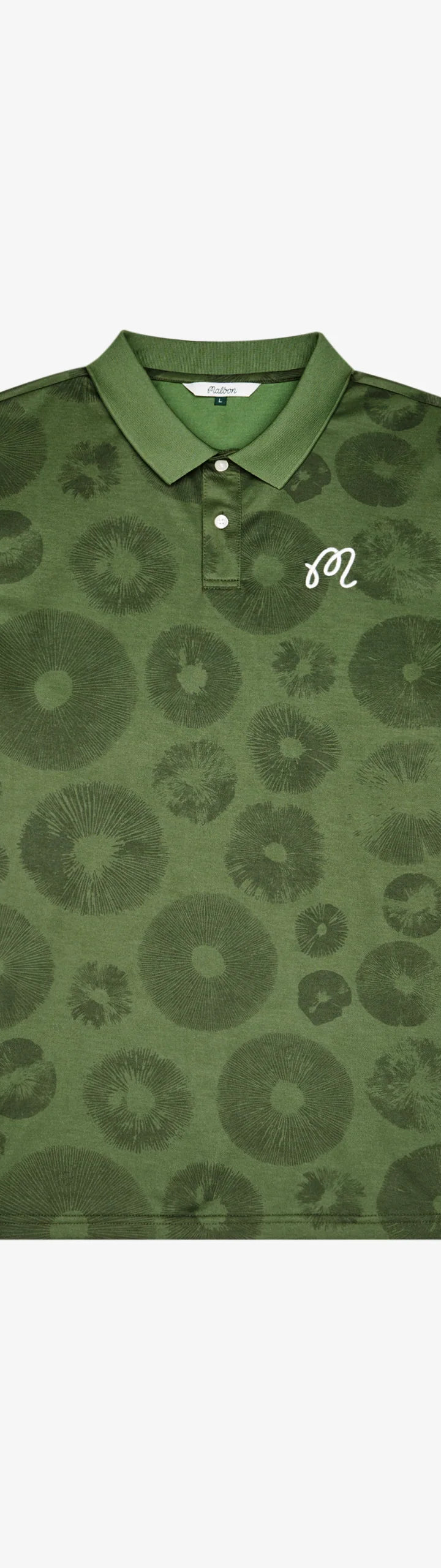 - Embroidered M script logo on left chest