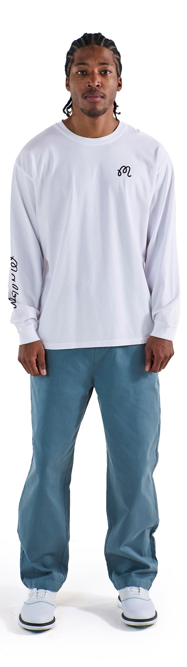 • M Script printed on left chest