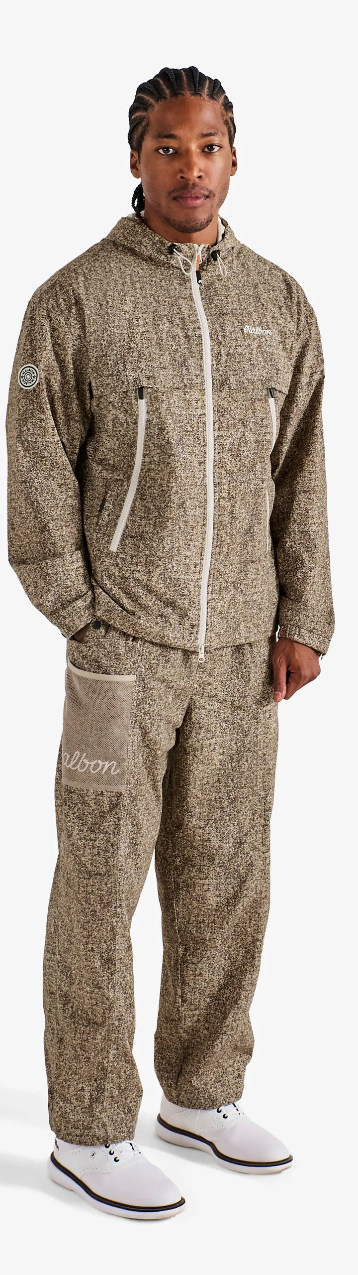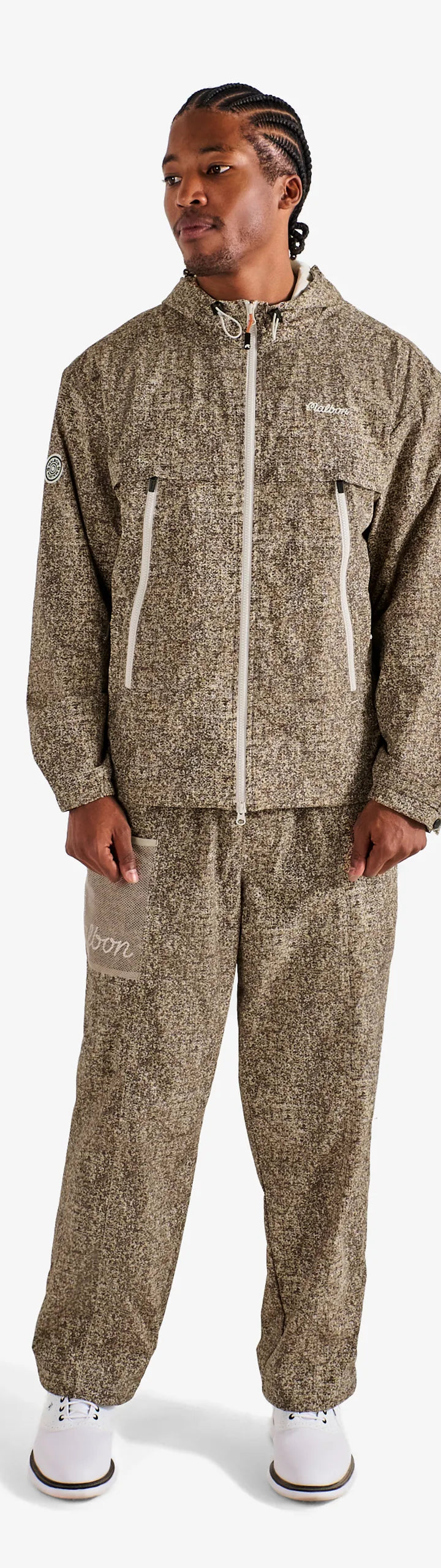 Our Highland Jacket brings weather-ready design into focus. Cut with a relaxed fit and featuring an all-over print, it's built with two sets of zippered pockets for storage, elastic cuffs and waist for secure fit, and adjustable button cuffs for personalized comfort. A 2-way zipper front with storm flap ensures protection, while the hood with drawcord detail adapts to all conditions.
