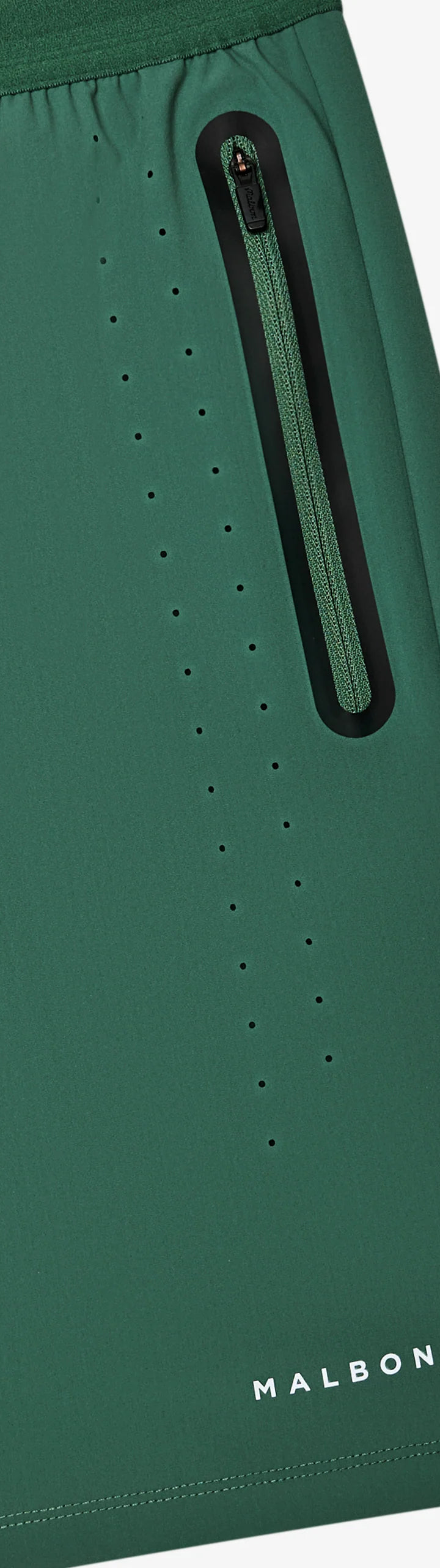 Part of Malbon's Performance collection, the 2-1 Shorts feature strategically integrated perforated panels to allow for optimal air flow and breathability. Other features include an elastic waist, interior compression shorts, and multiple zipper pockets offering functionality for enhanced performance.