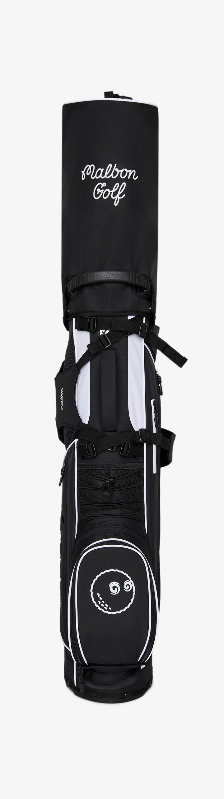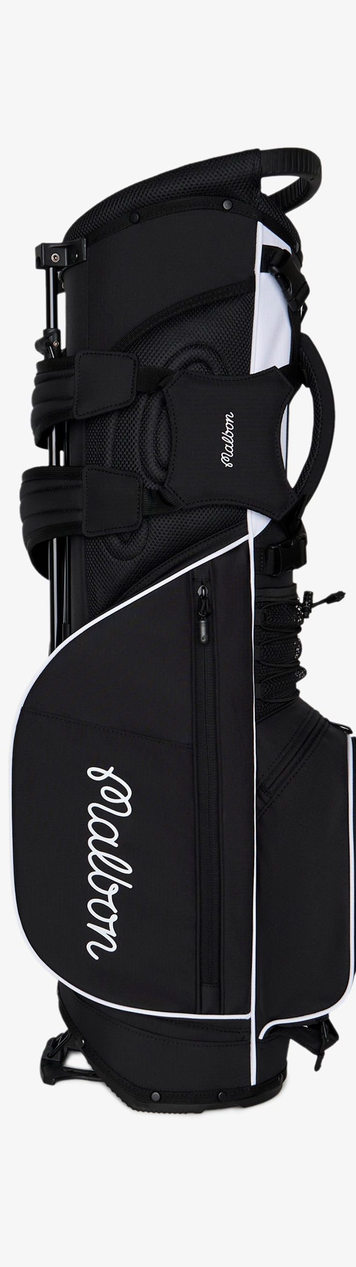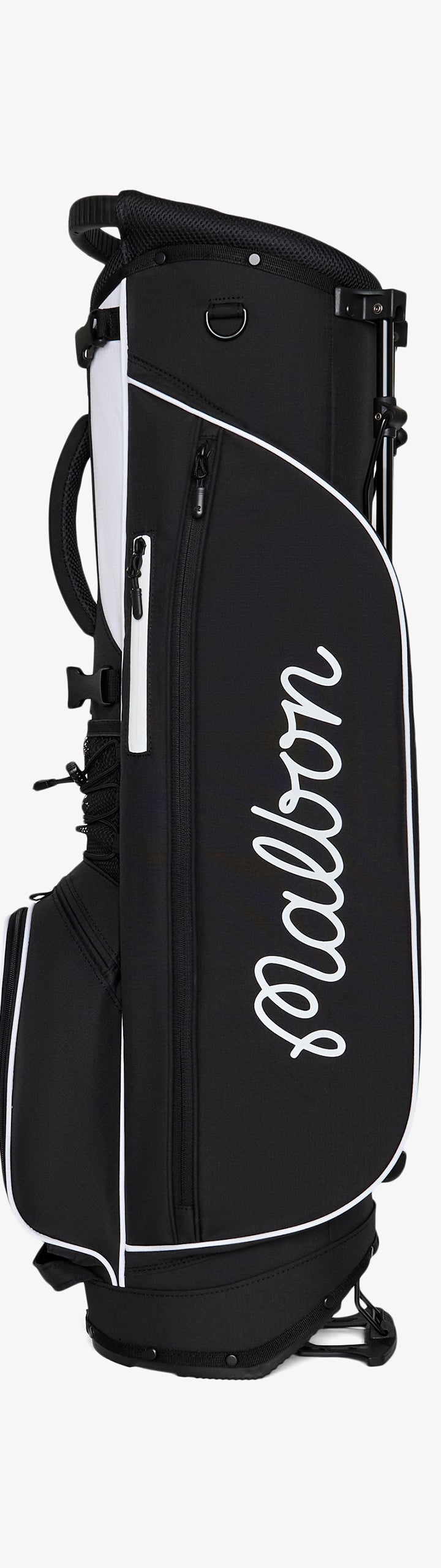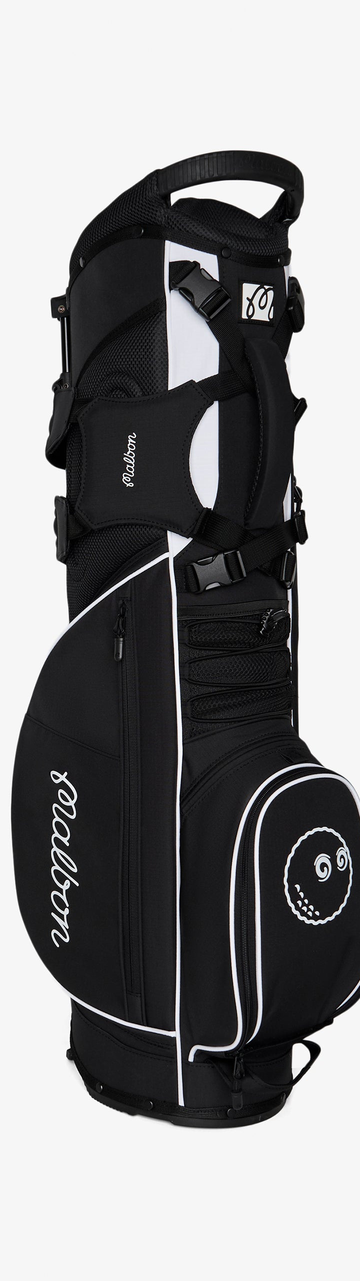 Showcasing signature Malbon branding, the Walking Bag is crafted from durable nylon rip-stop fabric, ensuring it can handle all your adventures on the course. It features multiple zippered pockets, including a convenient mesh rangefinder pocket and a magnetic closure pocket on the front for quick access to essentials. With a lightweight design—under six pounds—and cross back straps with clips, this golf bag provides maximum comfort for all-day rounds.
