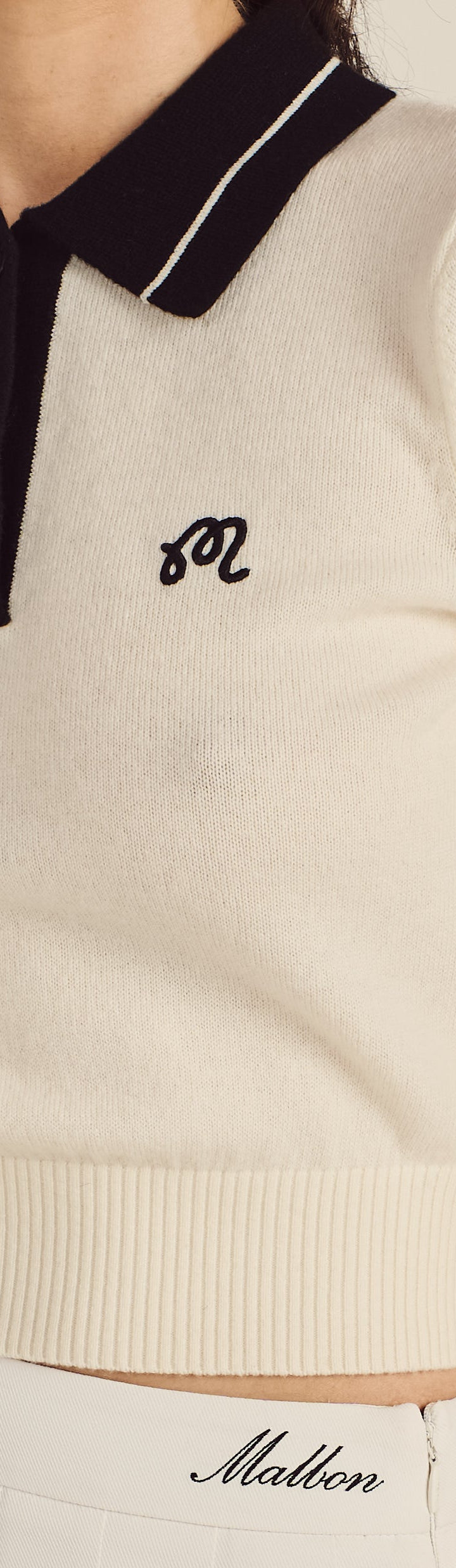 - Embroidered M script logo on left chest