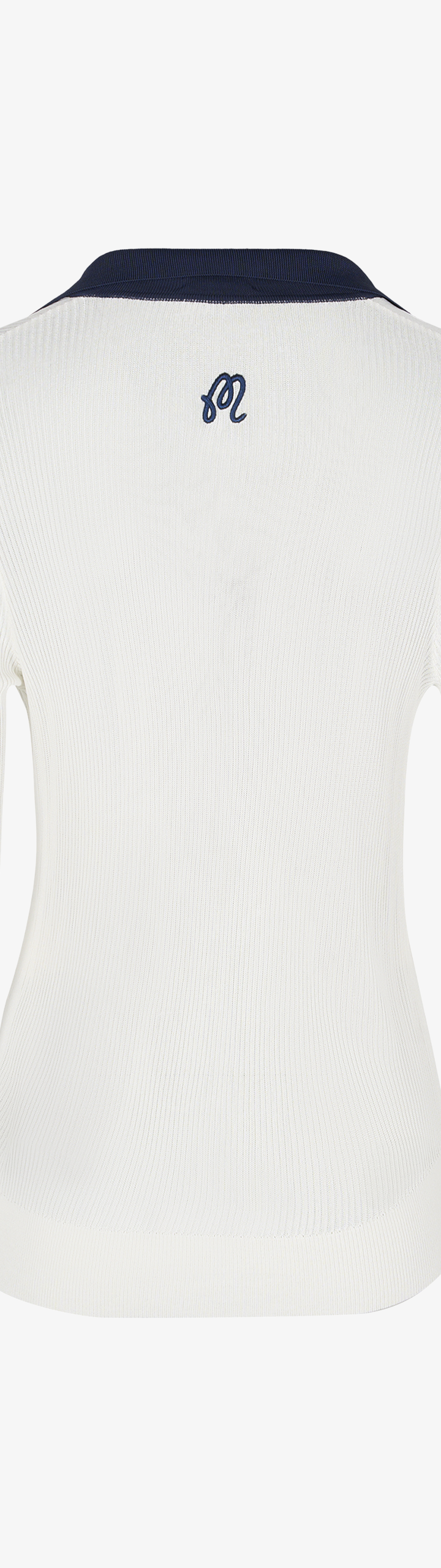 The Genevieve Top, made from a soft blend of 96% viscose and 4% nylon, features a rib knit collar, cuffs, and waistband for a flattering fit. Accented with a contrast knit flap on the neckline and an X stitch at the bottom of the placket, it’s finished with an M Script embroidered on the back neck for a signature touch.