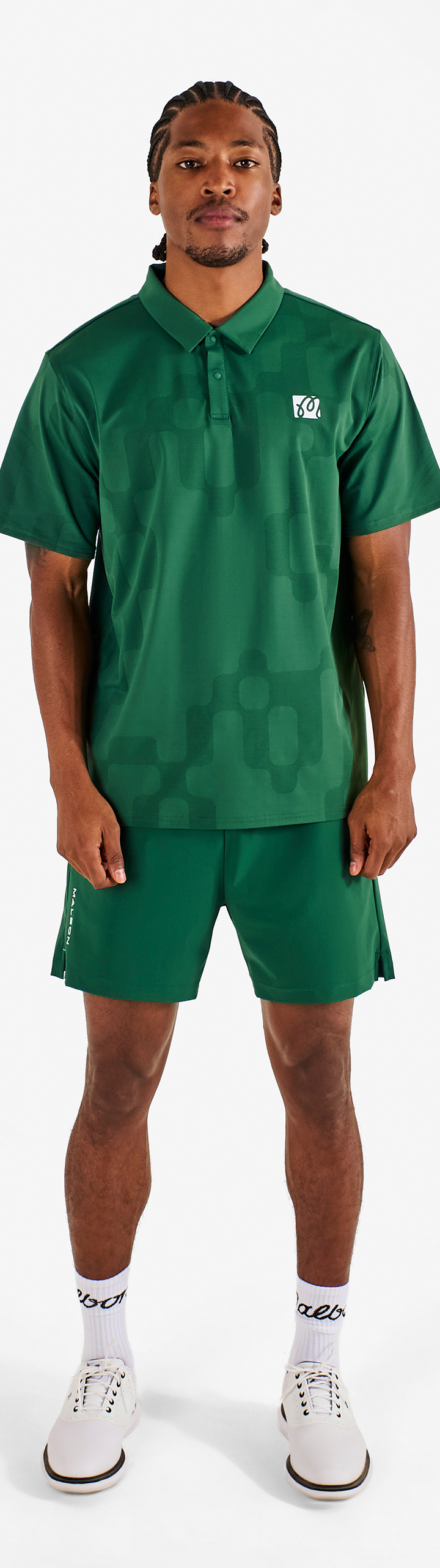 • Printed M script logo on left chest